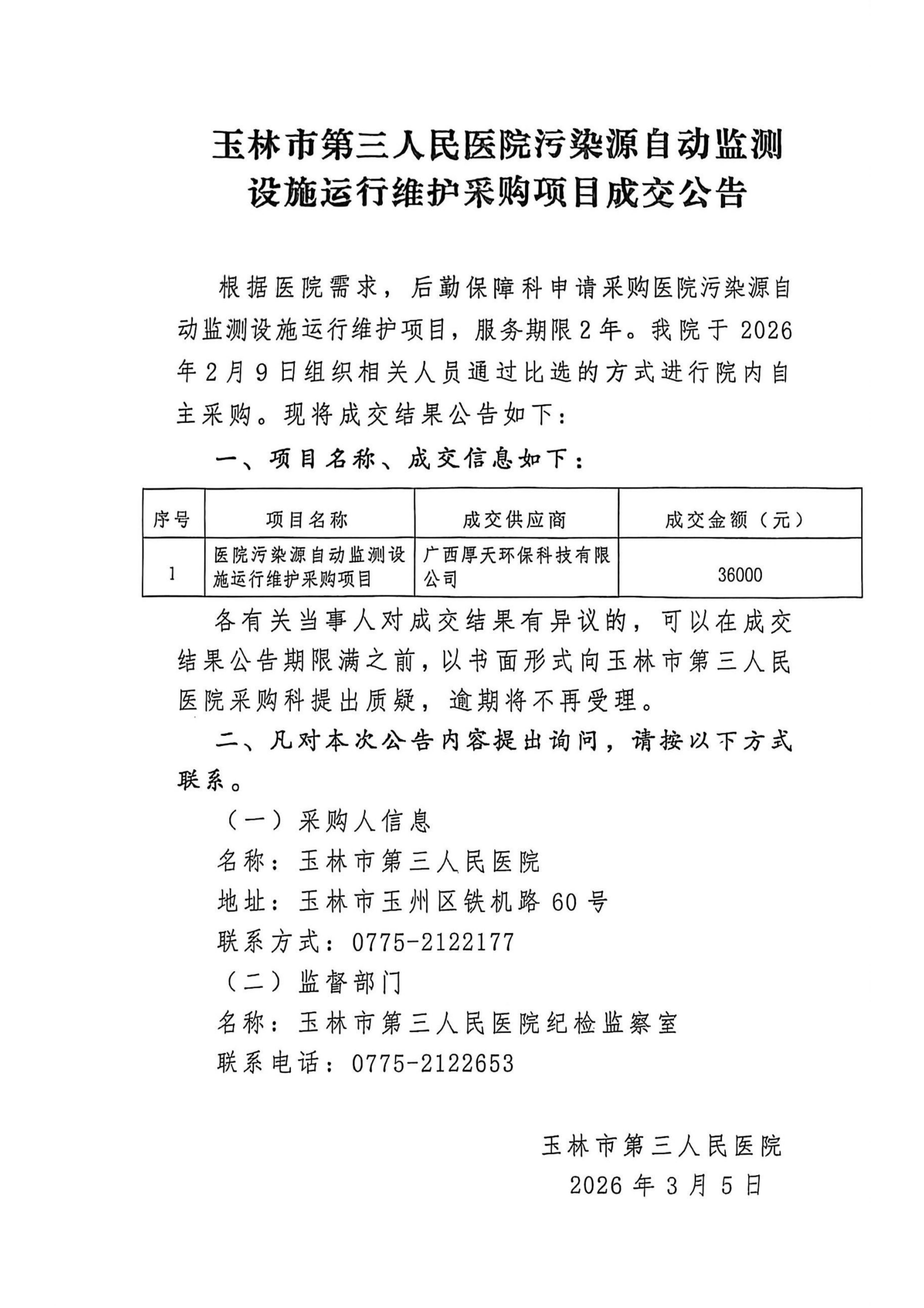 玉林市第三人民医院污染源自动监测设施运行维护采购项目成交公告