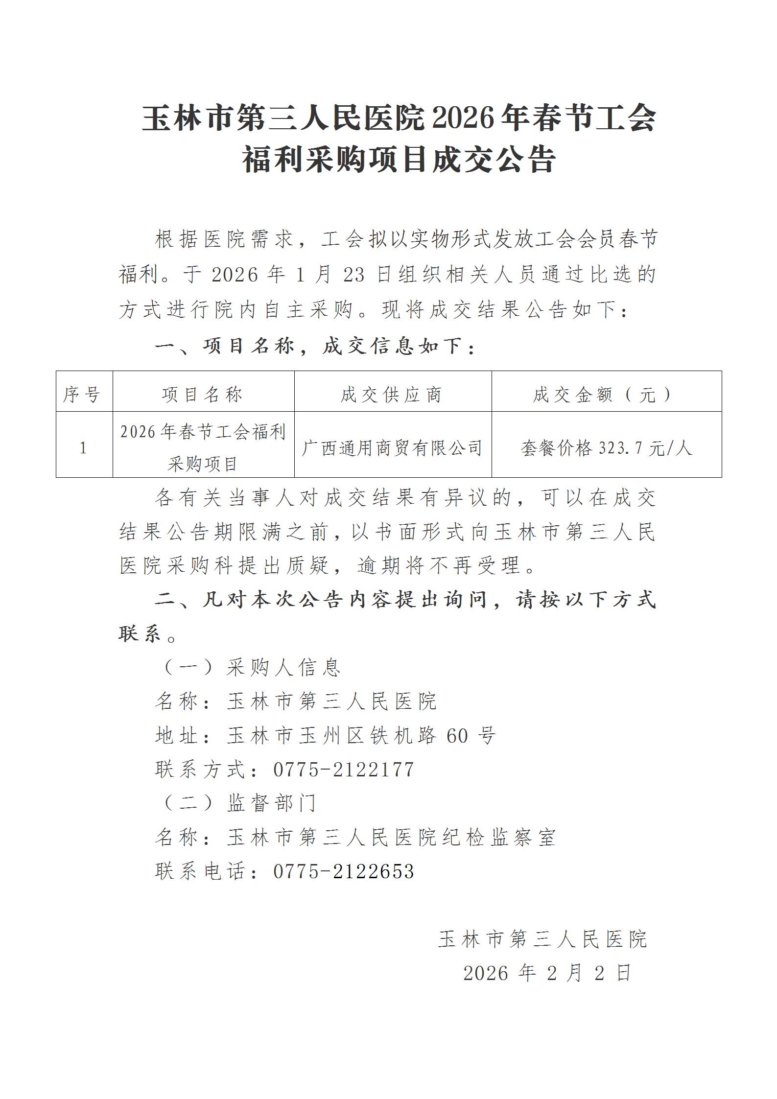 玉林市第三人民医院2026年春节工会福利采购项目成交公告