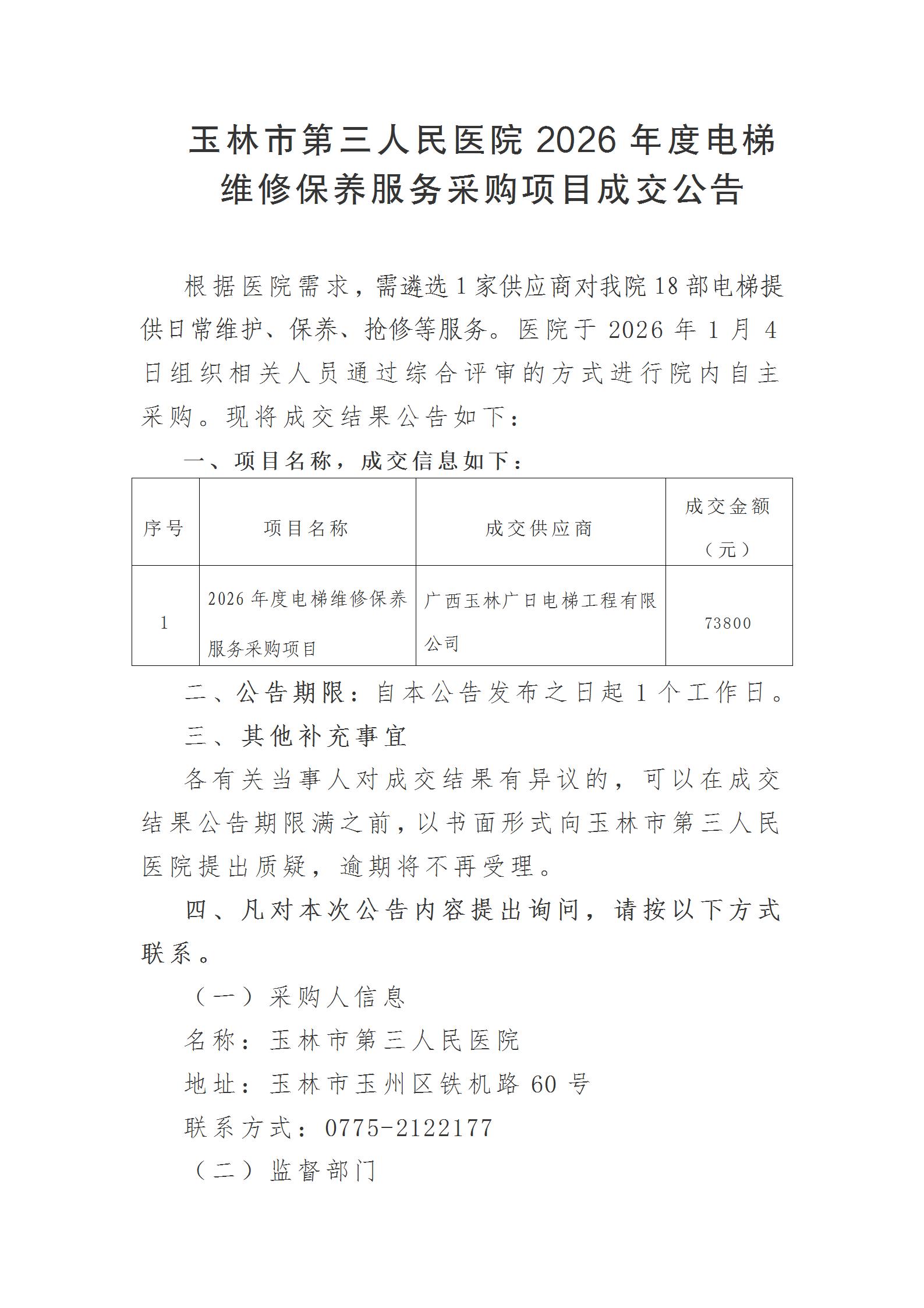 玉林市第三人民医院2026年度电梯维修保养服务采购项目成交公告