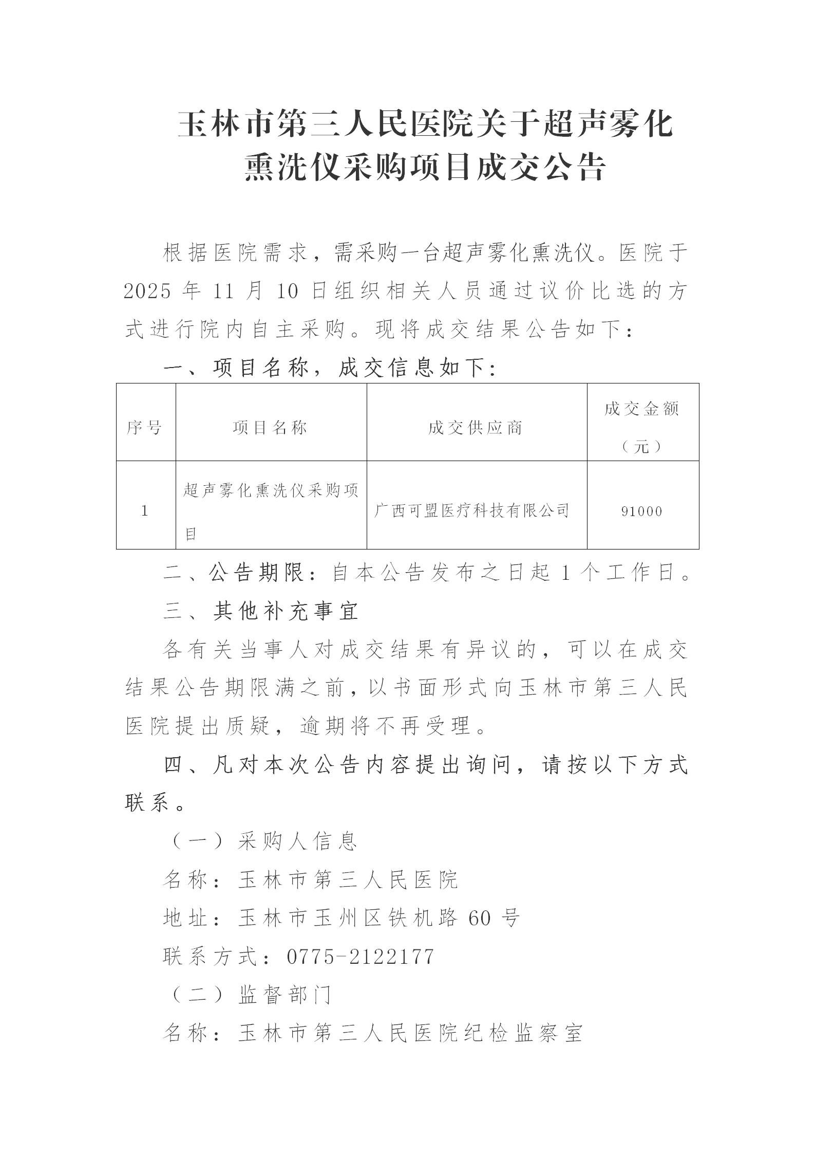 玉林市第三人民医院关于超声雾化熏洗仪采购项目成交公告