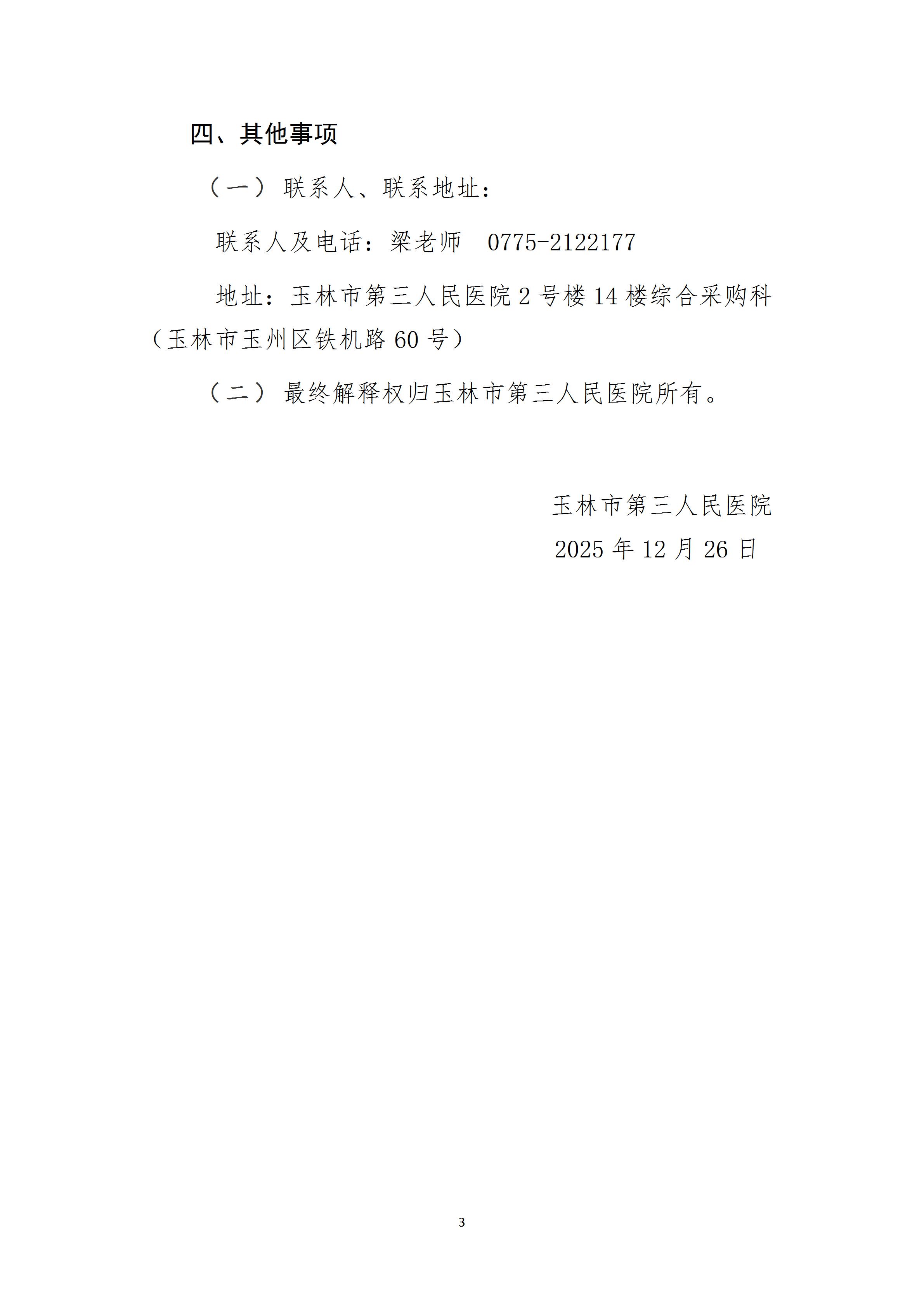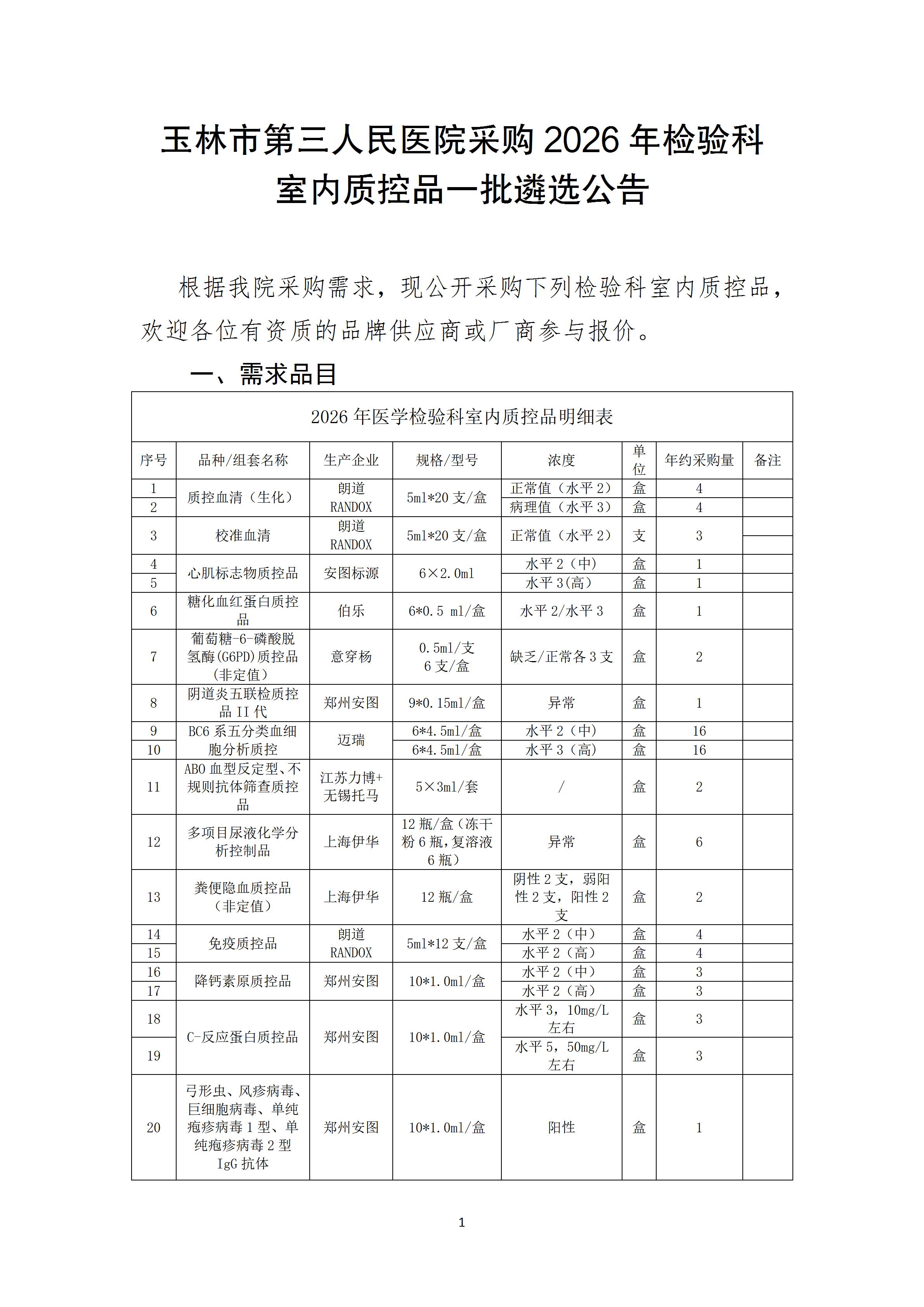 玉林市第三人民医院采购2026年检验科室内质控品一批遴选公告