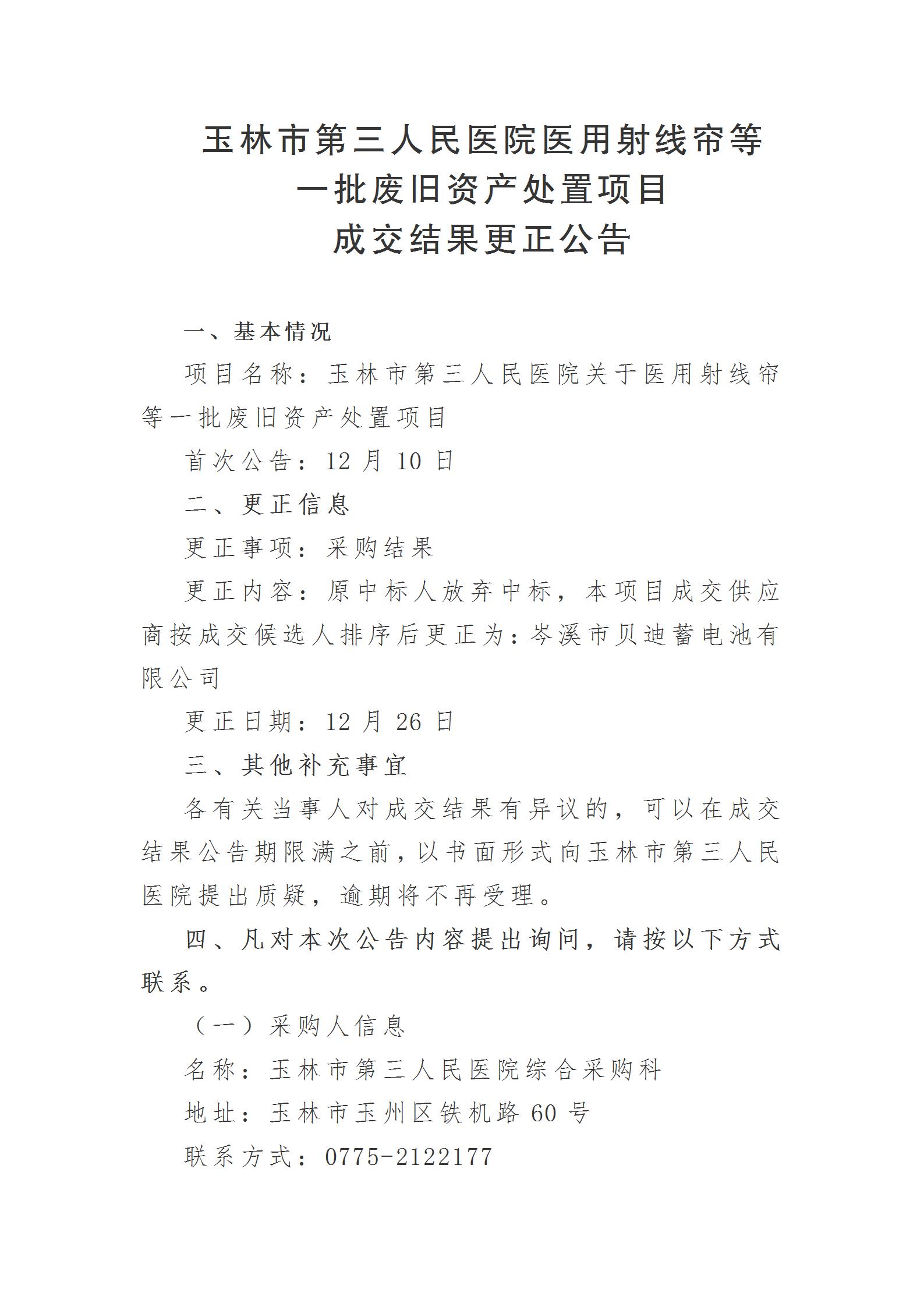 玉林市第三人民医院医用射线帘等一批废旧资产处置项目成交结果更正公告