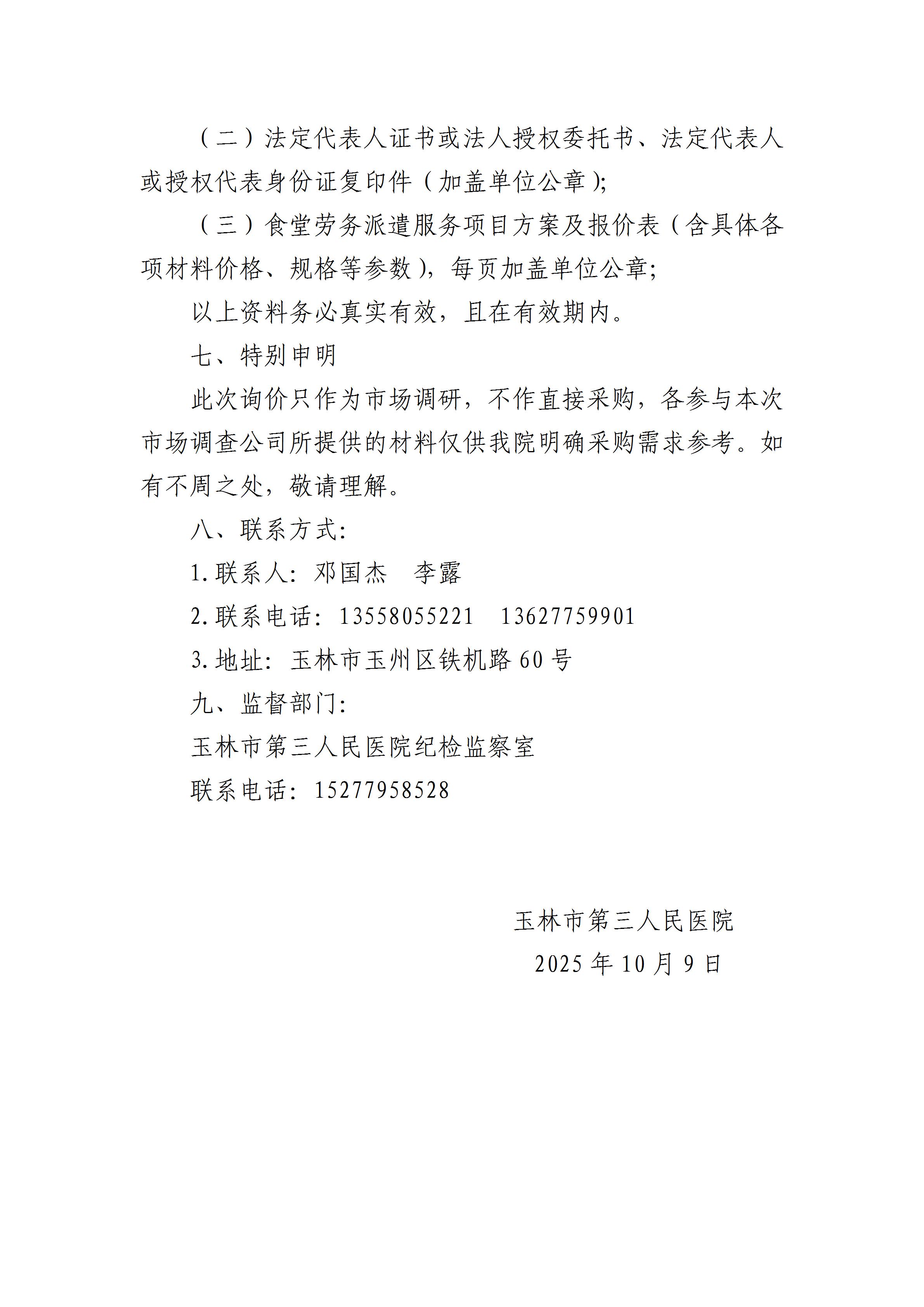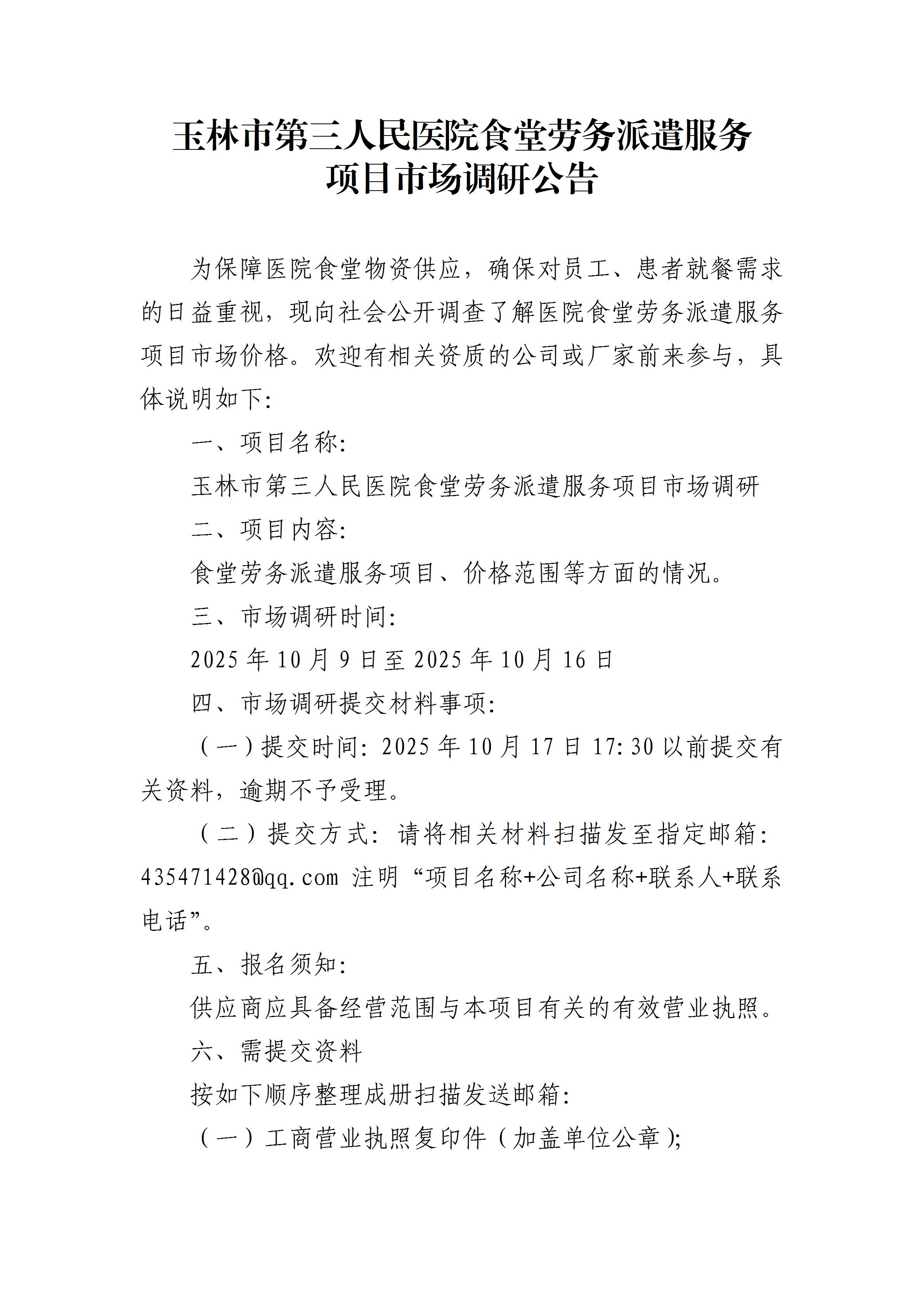 玉林市第三人民医院食堂劳务派遣服务项目市场调研公告