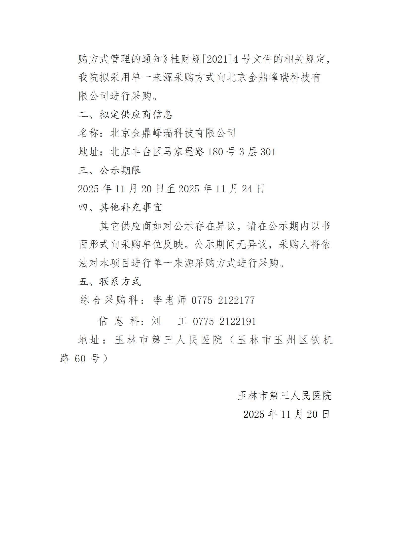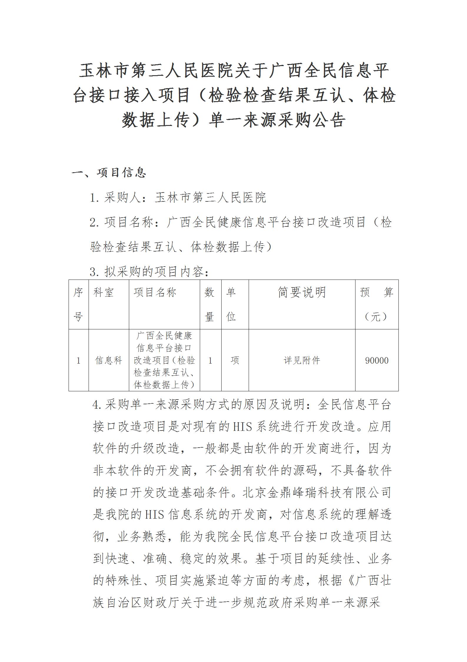 玉林市第三人民医院关于广西全民信息平台接口接入项目(检验检查结果互认、体检数据上传)单一来源采购公告