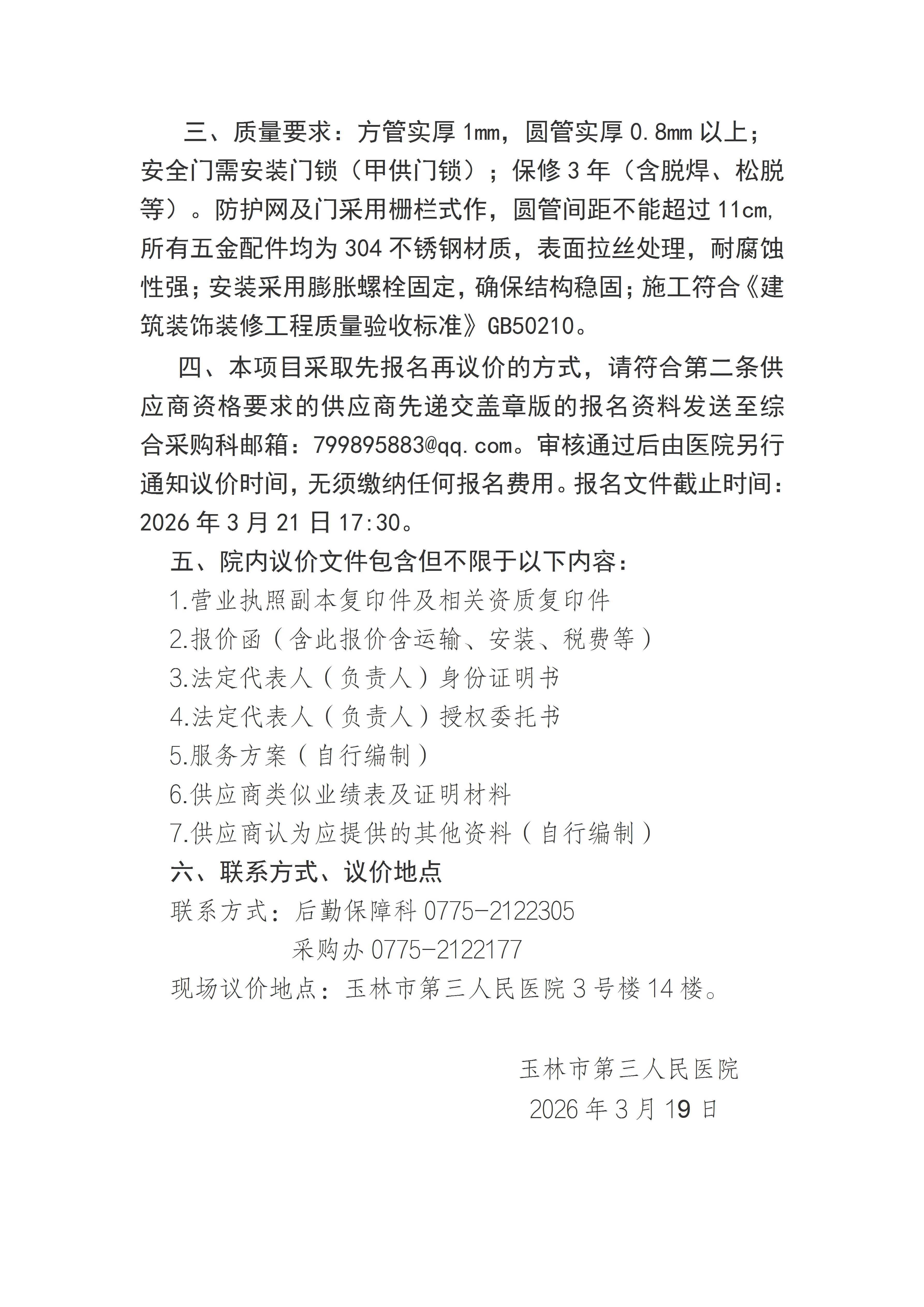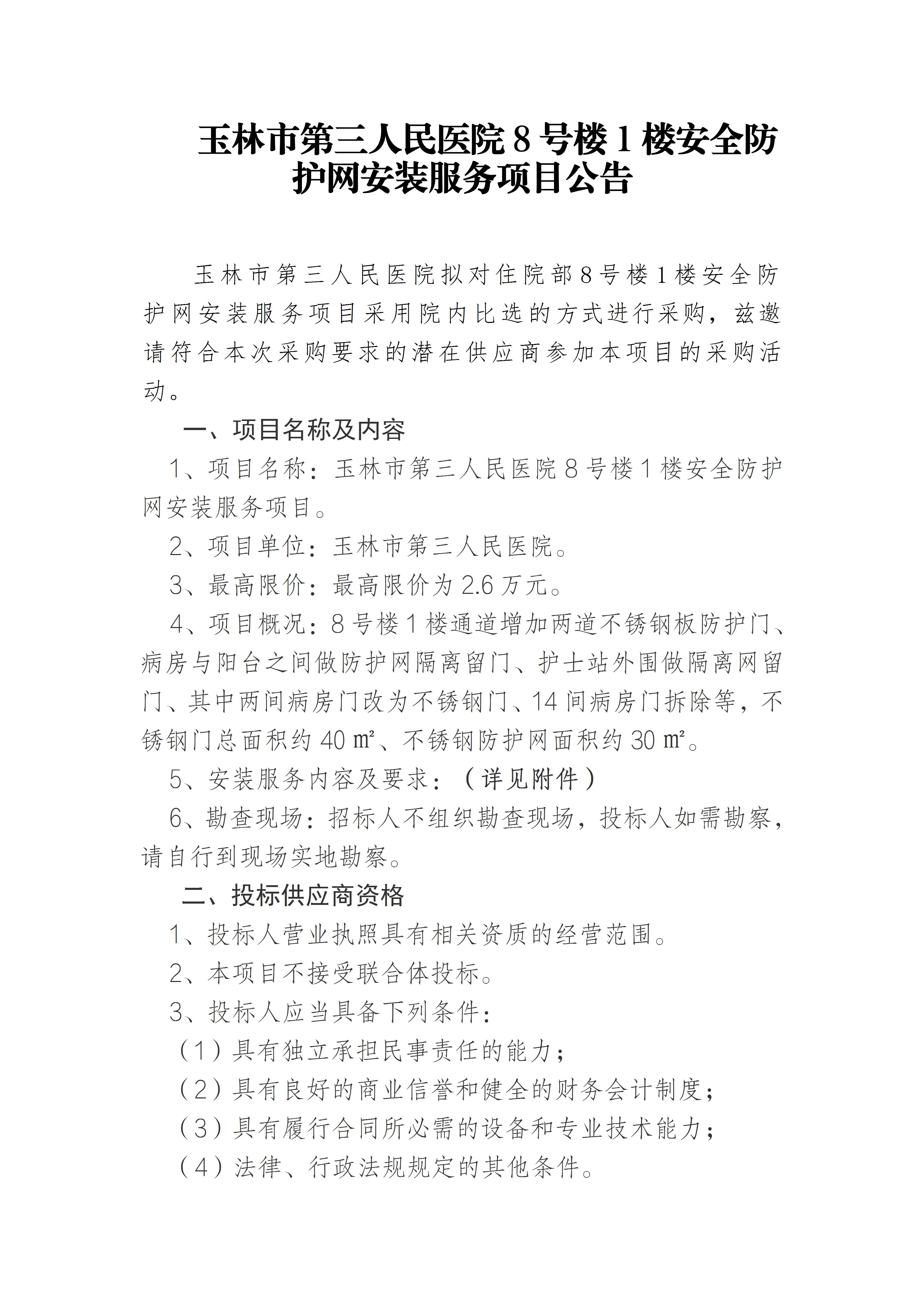 玉林市第三人民医院8号楼1楼安全防护网安装服务项目公告