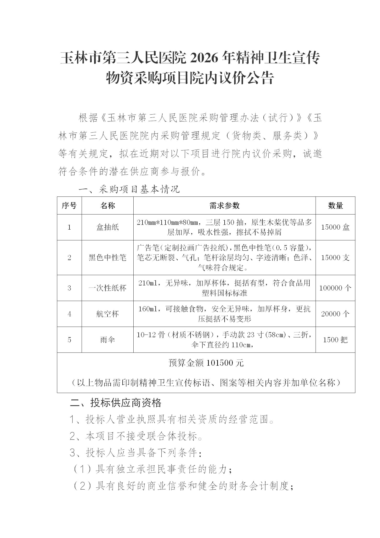 玉林市第三人民医院2026年精神卫生宣传物资采购项目院内议价公告