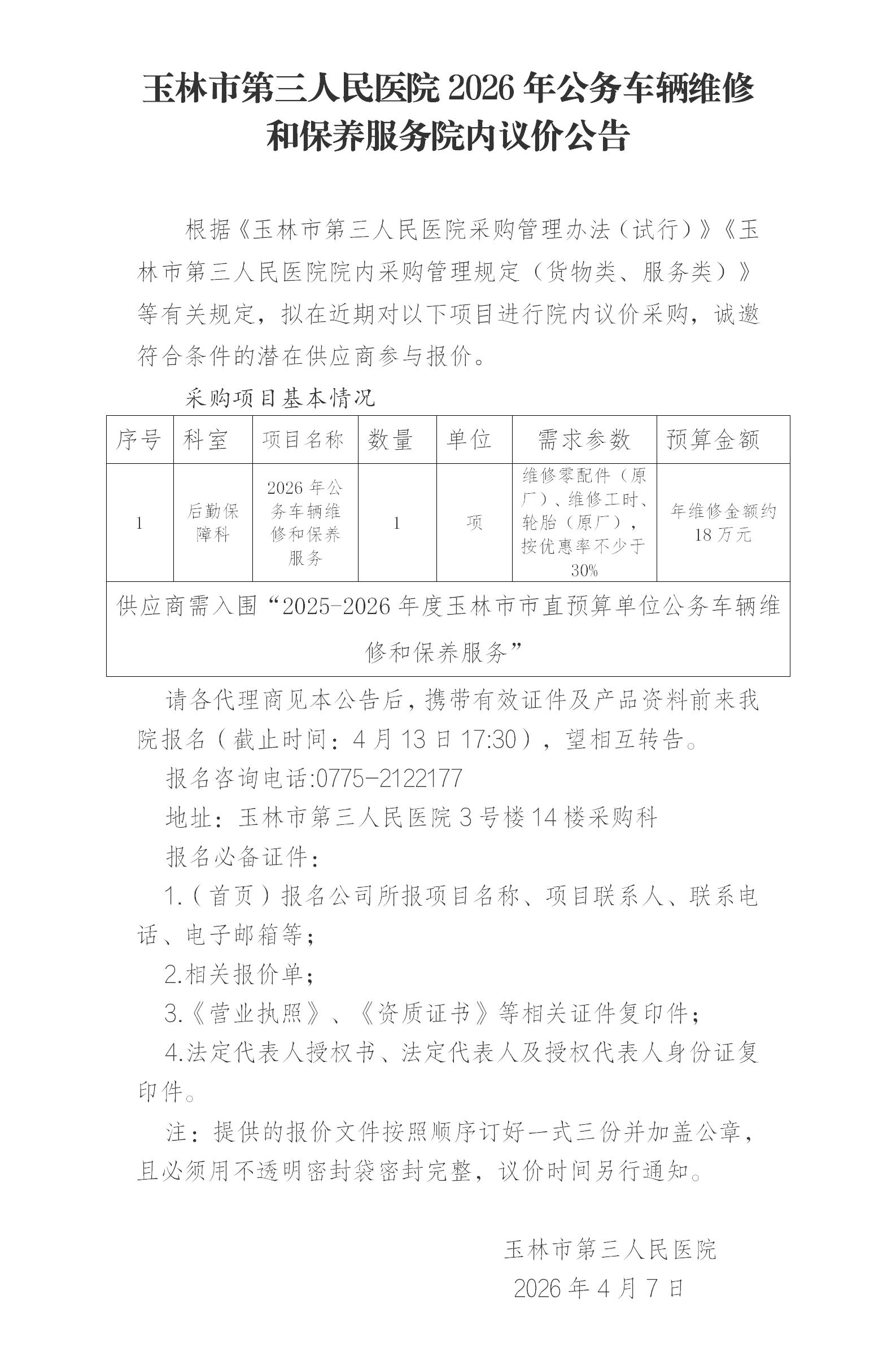 玉林市第三人民医院2026年公务车辆维修和保养服务院内议价公告